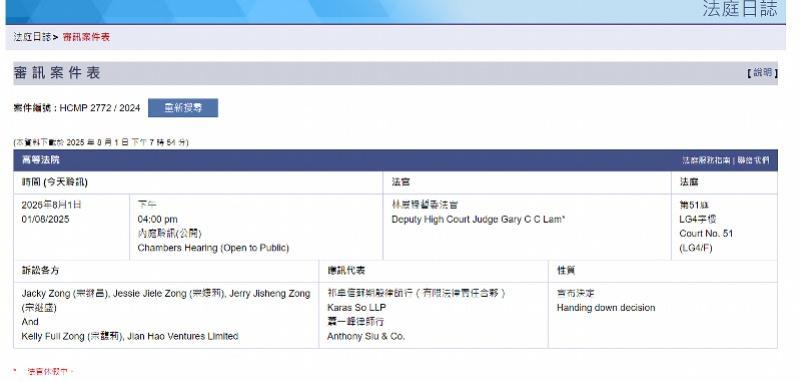 8月1日,香港高等法院在官网公布相关文件,裁定批准原告的保全令申请,同时修改部分条款,最终的裁定结果为:宗馥莉在杭州中级人民法院及浙江高级人民法院诉讼有结果前,除非法庭有其他命令,否则不得从Jian Hao Ventures Limited的香港汇丰银行账户提款或转账任何资产。