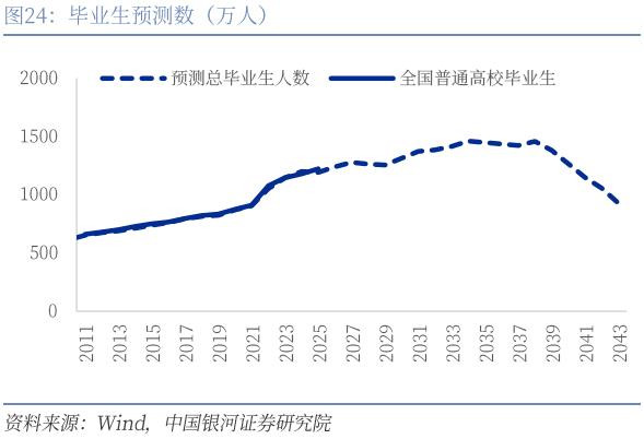 且据银河证券预测,高校毕业生人数将持续上升至2038年,峰值或达到1445万人。