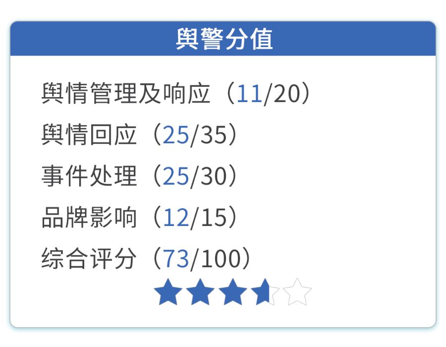 为此,南财·21消费新闻部综合企业在舆情预警与回应中涉及的公开操作维度,形成量化评分机制——具体而言,包含舆情管理及响应、舆情回应、事件处理、品牌影响四个一级指标和预防机制、回应直接度、信息透明度、处理长效性等14个二级指标,按照百分制根据重要性对不同指标赋值并打分,并以《消费舆警指数》对企业的应对速度、态度与有效度进行分析评价,为企业品牌管理与消费者的品牌认知提供参考。