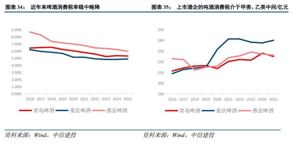 我们认为:1)啤酒消费税新规对上市公司整体影响有限,主因绝大多数啤酒企业旗下产品的内部调拨价<对外销售给第三方的价格,相当于新规前后的缴税方式变化不大。2)2025年青啤、重啤、燕京的吨酒消费税分别为225、240、226元/吨,吨酒消费税介于甲类、乙类啤酒中间,我们预计短期新规对上市啤酒企业影响有限。3)对于甲类、乙类的边缘性啤酒或产生部分影响,对于竞争格局或略有改善。