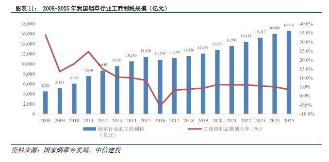 在这一垄断体制下,烟草行业长期维持高利税贡献。 2025年烟草行业实现工商税利总额16570亿元、实现财政总额15800亿元,均创历史新高。2008年以来行业工商税利和上缴财政规模总体持续抬升,烟草不仅是消费税的重要税目,也是财政收入中稳定性最强的来源之一。其背后逻辑正是:在国有专卖垄断框架下,行业利润、消费税、增值税及相关税费能够较顺畅地向财政端集中。