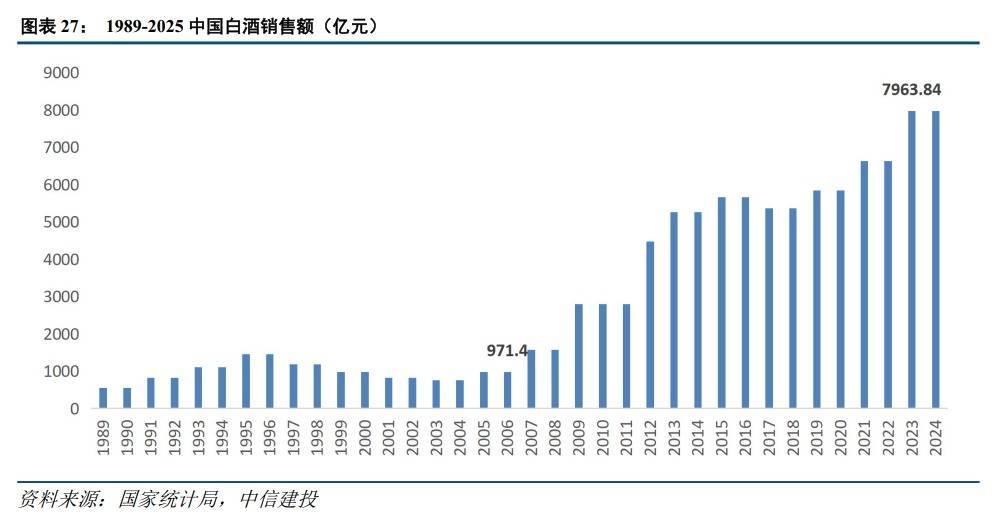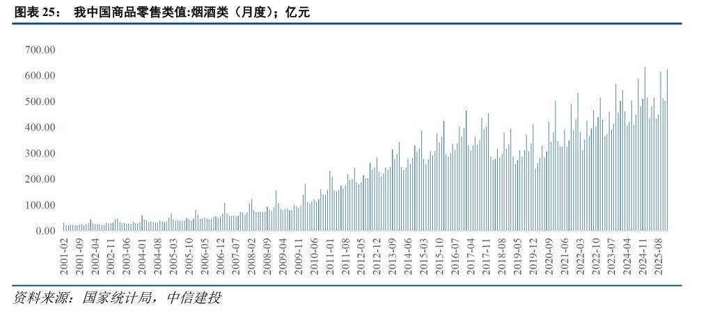 我国酒类体系较为复杂,白酒是核心利润池和最主要的税基载体。官方统计中酒类终端消费通常以“烟酒类”合并披露,烟酒类零售额长期呈现规模大、季节性强的特征,春节及中秋国庆前后通常出现明显销售高峰。烟酒消费税税基与烟酒类商品零售景气周期基本同步。2001—2012年,在宏观增长和政商务消费释放带动下,烟酒零售规模较快扩张;2013—2018年,随着政务消费约束加强和前期产能逐步出清,行业进入低速增长与结构调整阶段;2019年至今,行业增长中枢回落、季节性波动加大。