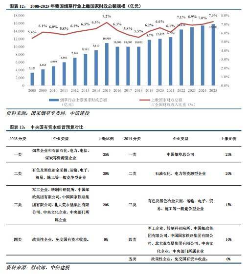 从最新政策信号看,烟草的财政属性仍在强化。财政部在《关于2026年中央国有资本经营预算的说明》中将烟草企业与石油石化、电力、电信、煤炭等资源型企业统一纳入第一类,税后利润收取比例提升至35%,明显高于2024年决算口径下烟草企业25%的上缴比例。按预算说明倒算,2025年央企上缴利润收入约3750.77亿元,同比增长约78.5%,其中第一类企业贡献约2854.8亿元,占比约76%。这表明,烟草不仅在消费税体系内具备极强稳定性,在国有资本收益体系中同样是财政贡献最厚、上缴约束最强的核心行业之一。