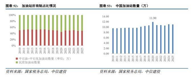 加油站是成品油税收的最终落地点,征管效果取决于终端管控。我国成品油零售体系整体呈现终端规模大、站点分散、主体多元的特征。全国加油站数量长期维持在10万座以上,2024 年民营加油站数量占比达 52.05%;但从销量口径看,民营企业销量占比仅约 25%,国营企业及其他占比约 75%。央国企主导的主干网络为征管提供了基础,但大量民营站点分布在区域市场和长尾终端,也使零售端天然具有点多、面广、高频、小额的特点。因而,成品油税制虽较成熟,实际征管效果仍高度依赖终端网络的透明度、规范程度和可追溯能力。
