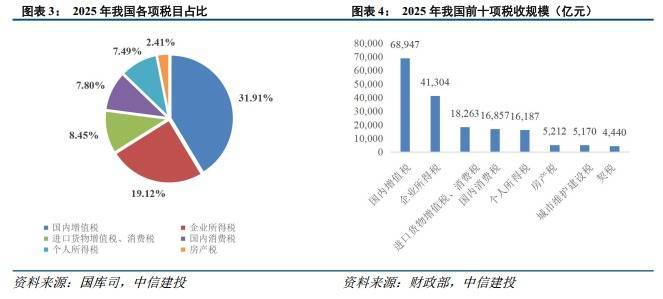 总体而言,2025年我国税收格局可以概括为:增值税居绝对主导地位,企业所得税保持第二支柱地位,消费税位于第二梯队前列且制度属性突出。