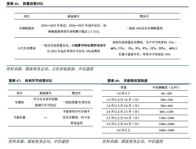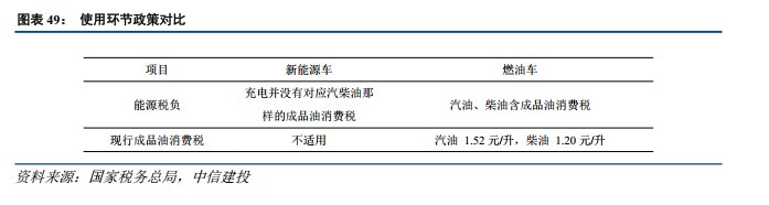 使用环节则是燃油车与新能源车税负差异的核心来源。燃油车在使用过程中持续消耗汽油、柴油,因此税负会随着行驶里程和燃料消耗不断累积,呈现出“随使用增加而持续发生”的特征,目前我国成品油消费税中,汽油税额为 1.52 元/升、柴油为 1.20 元/升。新能源车虽然同样需要补能,但充电环节目前并不存在与成品油消费税完全对应的同类税种,因此其使用环节税负明显更轻。这种差异意味着,燃油车属于“购置一次征税+使用持续征税”,而新能源车更多体现为“购置优惠+使用轻税负”,从而导致两类车型在全生命周期税负上逐步分化。