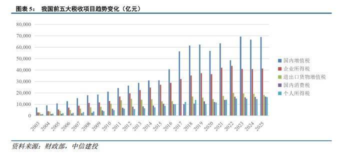拉长时间维度看,2003年以来我国前五大税种总体呈现持续扩容趋势,但近几年增速明显分化。根据财政部对2025年财政运行情况的解释,国内增值税全年保持平稳增长;国内消费税增长主要由卷烟、成品油等税目带动;企业所得税增长主要由制造业支撑;个人所得税则受工资薪金和股权转让、股息红利所得增长带动。当前税收结构并非简单同步扩张,而是更多体现为:增值税决定总盘,企业所得税反映企业盈利,消费税体现特定品类贡献,个人所得税更多受居民收入和资本市场活跃度影响。