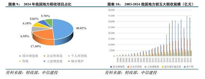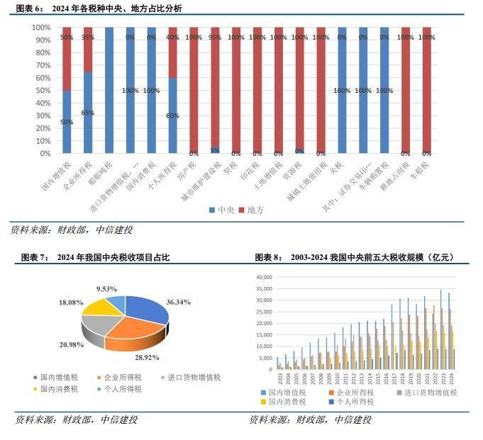 现行中央与地方收入划分格局下,国内增值税实行中央与地方五五分享;企业所得税、个人所得税原则上按中央60%、地方40%分享;国内消费税则基本全部归属中央。在此框架下,中央税源主要集中于国内增值税、企业所得税、进口环节增值税和消费税、国内消费税等税种;地方税源则更多依赖增值税分享收入以及契税、土地增值税、房产税、城建税等地方税种。2024年中央税收结构中,国内消费税已是仅次于国内增值税、企业所得税和进口环节税收的重要税源之一,而地方本级税源中并不包含消费税。