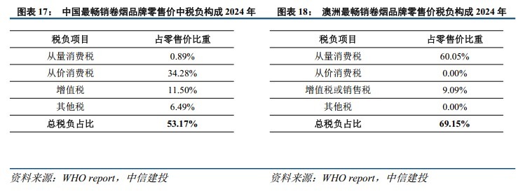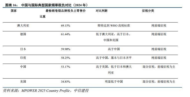 在全球范围内比较,我国烟草税负处于中等区间但尚未进入高税国家行列。以零售价格口径衡量,2024年中国最畅销卷烟品牌零售价中的总税负占比约为53.17%,高于美国(34.85%),低于日本(59.9%)、德国(61.4%)及澳大利亚(69.2%),略低于全球中位数(约56%)。在此基础上,各国差异更多体现在税制结构与价格形成机制,高税国家普遍以从量税为主,税负集中于生产或进口环节并通过市场化价格直接传导,同时压缩低价烟空间以强化控烟效果。而我国采用的生产环节为主、批发环节补征的复合征收模式,以从价税为主并叠加专卖体系下的价格与渠道管控,使税负能够较为充分且平稳地向终端传导,价格体系整体更具可控性。综合来看,我国烟草税制在保障财政收入和维持市场稳定方面表现更为突出,其核心优势不在于税负绝对水平,而在于税负可实现性与财政稳定性,在税基集中、征管可控的制度基础上,持续构成消费税体系中最具确定性的核心税源之一。