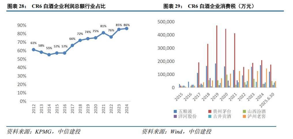 这种分化也决定了白酒消费税的税源显著头部集中。在生产端征收的模式下,头部名酒企业构成了白酒消费税的核心税源。CR6 企业(茅台、五粮液、山西汾酒、泸州老窖、洋河、古井贡酒)的利润总额占行业的比重达到 86%,占比从 2014 年的 55% 提升至 2024 年的 86%,呈现逐年增长的趋势,行业集中度上升。与此相对应的,消费税缴纳规模同样高度集中:贵州茅台2018—2021年消费税分别约为33.15亿元、47.08亿元、44.59亿元和41.24亿元,近年虽有所回落,2024年仍达20.87亿元;五粮液近年来消费税亦长期维持在10亿-20亿元区间,2024年约为16.90亿元;泸州老窖近年来基本维持在12亿—14亿元区间,2024年约为14.43亿元;山西汾酒、洋河股份、古井贡酒虽体量相对较小,但近年多数也维持在数亿元至近10亿元水平。整体看,白酒消费税并非均匀分布在全行业,而是高度依赖少数头部酒企及其生产地,这意味着现行征收模式下税源的稳定性和可征收性相对较强。