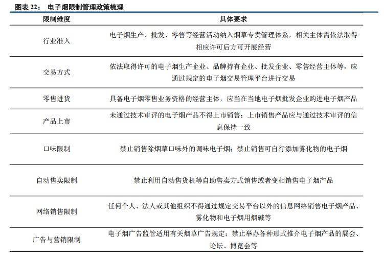 在传统卷烟税制已高度成熟、税基与征管体系相对稳固的背景下,烟草消费税的边际变化空间更多依赖增量税源的拓展,监管与税制框架因此逐步向新型烟草制品延伸,电子烟成为制度扩围的重要方向。2022年以来,电子烟被正式纳入烟草专卖体系,并同步纳入消费税征收范围,工业端按36%、批发环节按11%征收,同时通过统一交易平台、零售许可管理以及口味限制、渠道规范和未成年人保护等制度安排,推动行业由此前的快速扩张阶段转入规范监管阶段。
