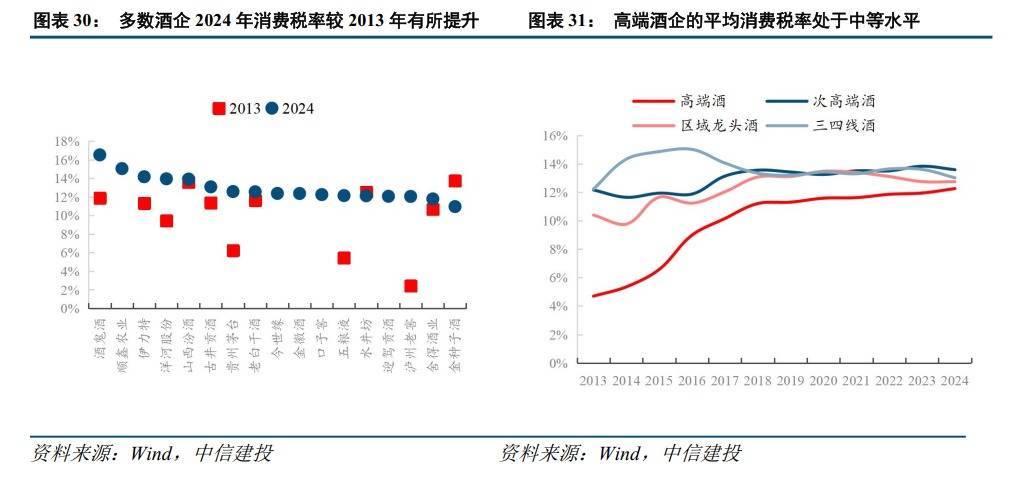现行消费税体系下,高端酒整体税率低于低端酒。由于白酒的消费税为从价税+从量税,从量税(每斤(500克)0.5元或0.5元/500毫升)显著利好高端酒,因此高端酒企消费税率显著较低,2024年高端酒、次高端酒、区域龙头酒、三四线酒的消费税率均值分别为12.3%、13.6%、12.7%、13.0%。