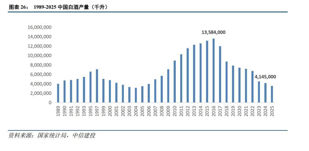 供给端:白酒行业呈现“量减价增、结构分化、利润集中”。从供给端看,白酒产量自2016年达到顶峰的 1358.4万千升持续下降至2024年的 414.5万千升,整体产能萎缩近70%。供给走出品牌化、高端化发展,落后产能加速出清。