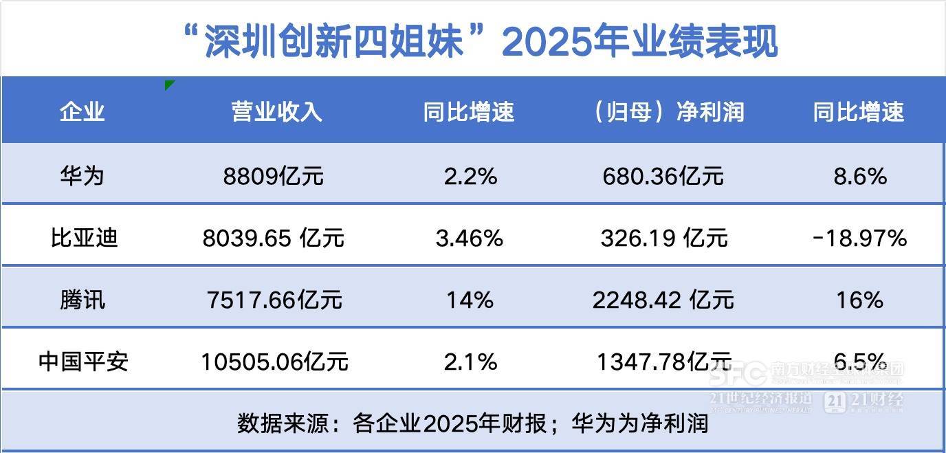2025年,华为、比亚迪、腾讯、中国平安“深圳创新四姐妹”,在业绩表现、技术/AI布局、全球化三条主线上走出了差异化路径:华为以技术定力实现稳健复苏,比亚迪在行业高度竞争中坚守长期投入,腾讯依托AI开启高质量增长,中国平安在寿险改革、风险渐出清后保持增长。